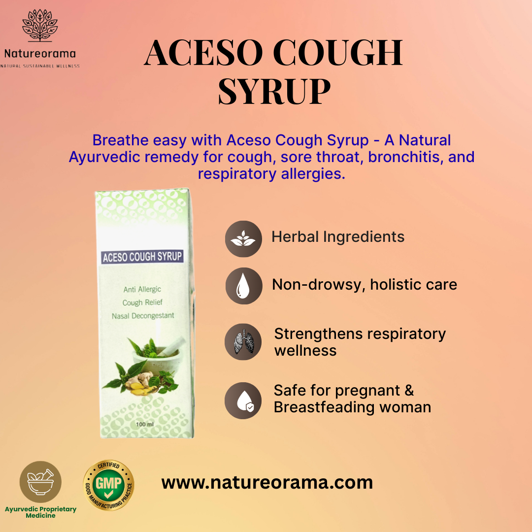 Aceso Cough Syrup is an Ayurvedic formulation designed to relieve respiratory issues such as wet and allergic cough, sore throat, bronchitis, and hoarseness of voice. Enriched with herbs like Glycyrrhiza glabra, Ocimum sanctum, and Adhatoda vasica, it supports respiratory health and boosts immunity. This natural, non-drowsy remedy ensures lasting relief and holistic well-being.