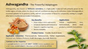 Ashwagandha (Withania somnifera) is a premium medicinal herb widely recognized for its powerful adaptogenic properties, primarily cultivated in the fertile regions of India. Renowned for its potency, purity, and rich concentration of bioactive compounds, Indian Ashwagandha is sought after globally in both traditional and modern formulations. It is known to reduce stress and anxiety, enhance stamina and endurance, support cognitive function, and boost immunity. This versatile herb is commonly used in a variety of products, including herbal supplements, teas, nutraceuticals, stress relief formulations, and cosmetic products, making it an essential ingredient in the wellness, pharmaceutical, and personal care industries.