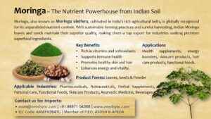 Moringa (Moringa oleifera), cultivated in India’s fertile agricultural regions, is globally renowned for its exceptional nutrient content, making it a top superfood ingredient. Grown using sustainable farming practices and carefully harvested, Indian Moringa leaves and seeds maintain superior quality, making them highly sought after in the global market. Packed with vitamins, antioxidants, and essential nutrients, Moringa supports immune health, promotes healthy skin and hair, and boosts energy and vitality. It is widely used in health supplements, energy boosters, skincare and hair care products, and functional foods, and is a valuable ingredient in industries such as pharmaceuticals, nutraceuticals, personal care, Ayurveda, and beverages.
