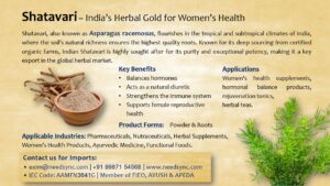 Shatavari (Asparagus racemosus) is a powerful medicinal herb that thrives in the tropical and subtropical regions of India, where the soil’s natural fertility ensures the highest quality roots. Sourced from certified organic farms, Indian Shatavari is highly valued for its purity and exceptional potency, making it a key export in the global herbal market. Known for its hormone-balancing properties, Shatavari acts as a natural diuretic, strengthens the immune system, and supports female reproductive health. It is widely used in a variety of applications, including women’s health supplements, hormonal balance products, rejuvenation tonics, and herbal teas, offering versatile benefits for overall wellness and vitality.
